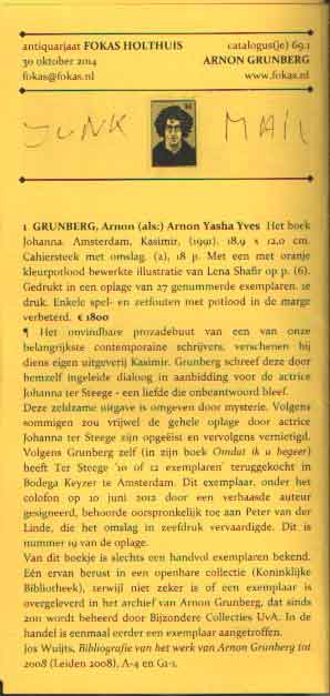 Catalogus 69.1, Arnon Grunberg, Junk mail. Met o.a. het onvindbare Johanna door Arnon Yasha Yves.